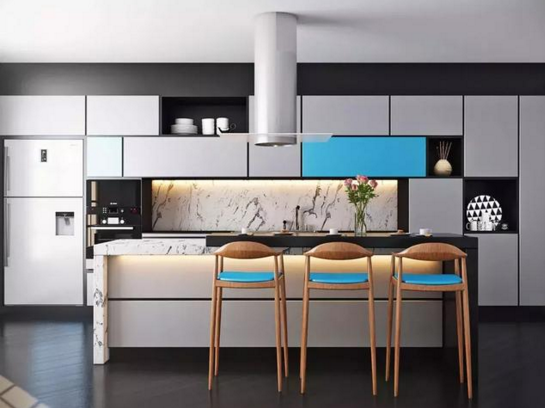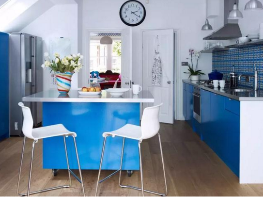 藍與白的結合,猶如西班牙蔚藍色的海岸與白色沙灘;希臘的白色村莊,在碧海藍天下,簡直是制造夢幻的絕佳搭配。用在廚房中,凸顯雅致和清新。