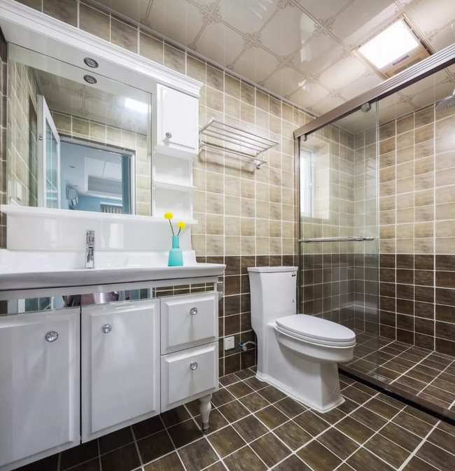 ▲主衛的墻面墻面與公用衛生間一樣的褐色地磚,顯得復古調滿滿的。