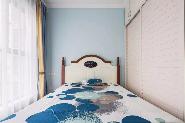 ▲次臥保持清新精致的空間格調下,一張象牙白色的床與木色的床體框架,還有百葉紋理的衣柜門,搭配上一張精致的床單,顯得格外的優雅溫馨。