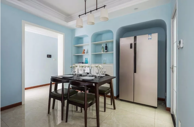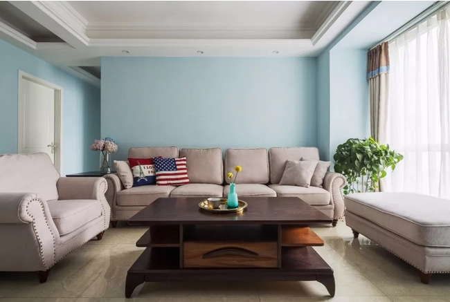 ▲整個開放區域的墻面都以淡藍色刷新,簡單卻又透著一股自然清新的氣息。一套舒適精致的現代美式布藝沙發,布置在這個寬松的客廳里,顯得格外的舒適自然。
