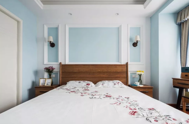 ▲臥室的床頭背景墻以邊框造型,造型內部藍色+四周白色的藍白配,結合對稱的壁燈與床頭柜,整個空間都顯得格外的穩重清新。床頭柜上布置著 精致的插花,一本書籍一個茶杯,整個空間都顯得情調而溫馨。