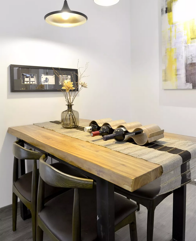 空間利用的剛剛好,實木的餐桌和餐椅,很有質感,與客廳的書香氣也很搭,餐廳與客廳的隔斷,前面也提到了,這里細說一下,小隔斷不擋光,仿水泥材質兼具質感與美感。