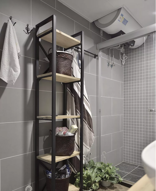灰色調為主的衛生間,避免純灰的單調,選用了三種不同花樣不同尺寸的貼磚,顯得很有層次感。還有一個兼具裝飾與實用性的置物架。