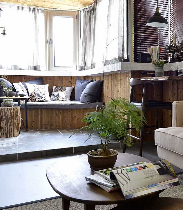 曲線環繞形的窗戶區域,簡直是家里光源的主要功勞者,木質天花與下方木質墻面相呼應,統一性與整體性讓人在這個空間中,很舒服,還有空間分割做了小臺階,