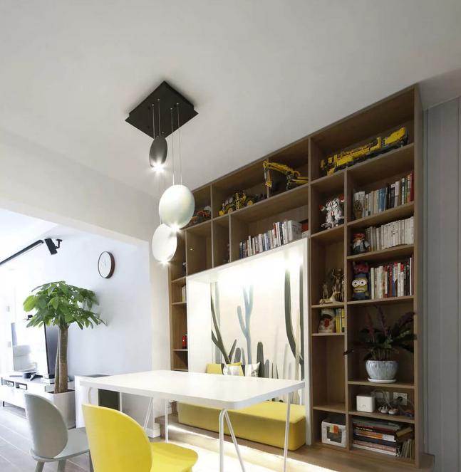 餐廳的位置比較暗,運用隱藏式輔助光源改善光感,軟裝采用綠色與黃色做點綴賦予生機感。墻面的異形置物架又能滿足儲物與展示的需求。