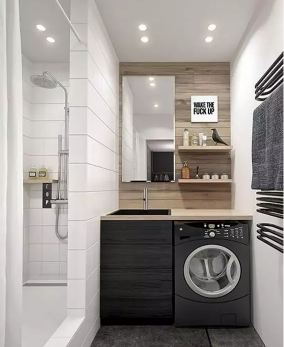 洗漱臺下預留洗衣機的位置,不僅節約空間,也讓衛生間顯得非常整齊。洗衣機在洗漱臺下,將水注入洗衣機中,也非常方便。