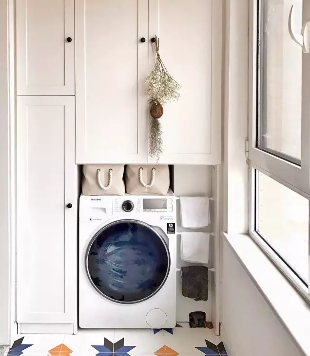 衛生間面積不夠,或者覺得陽臺放洗衣機比較方便的小伙伴 ,也可以考慮把洗衣機放陽臺,這樣洗完直接晾曬。