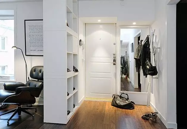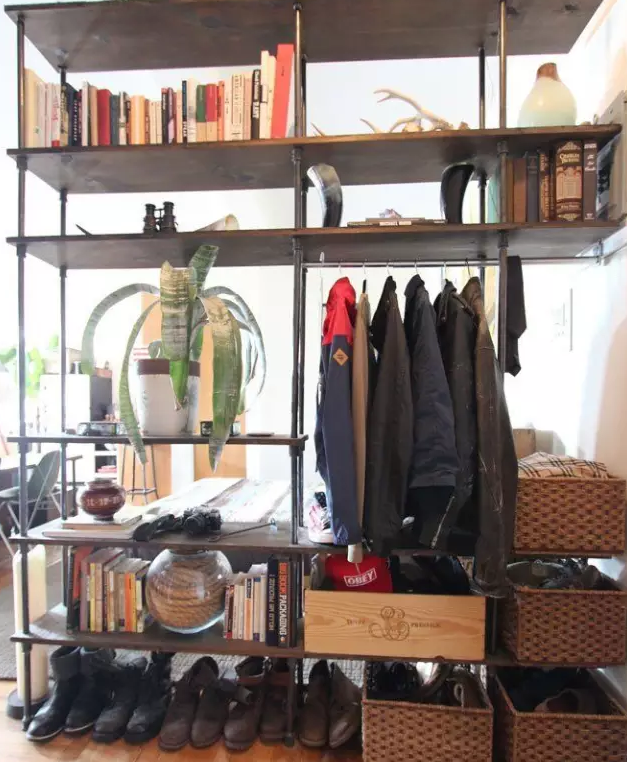 小戶型、一居室,床和門口離得近,不如在玄關處安裝一個大型置物架,不僅收納出門衣物,還能履行房間里的其他收納任務。只要你不擺的太滿,就不會影響采光。