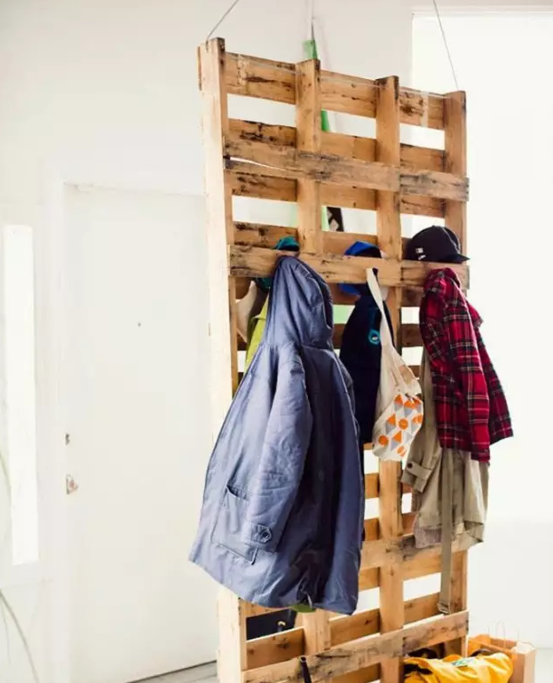 廢物利用妙極了,粗獷的原木色,又有天然的掛桿,吊起來就是個完美的玄關隔斷。