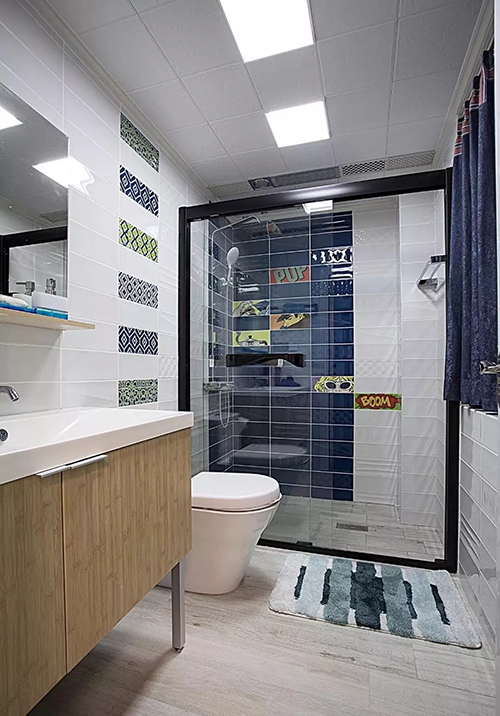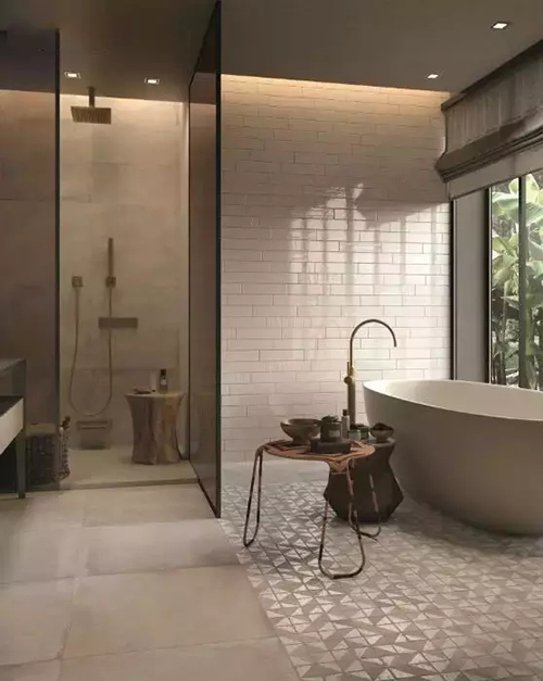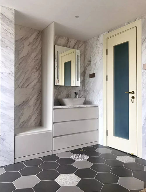 利用花磚給空間分區,是效果最柔和也最能營造空間層次感的做法,一般使用于衛浴間、廚房。
