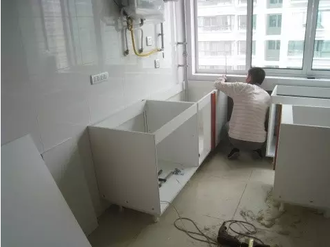 3、進行櫥柜、油煙機等炊具的安裝,水槽(上下水件稍后安裝)和煤氣灶也要跟上,記得通知物業開通煤氣測試一下。