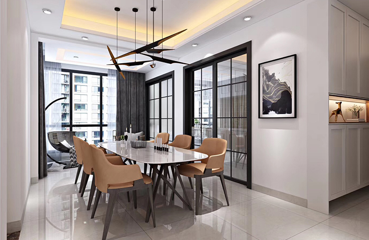 對于采光不好的餐廳來講,如果只是利用光源設計來進行調整與改變,要知道餐廳裝修過程中本來就是忌諱使用大量的光源,這會使人們在就餐時感到非常不舒服,而采用現代簡約的裝修風格,就算只是在一盞水晶吊頂的搭配下,也會令餐廳的光線十足,如圖,采用不吊頂的簡裝,但是天花板以淺色系的白色主打,配以淺色的地板,會令整個空間顯得簡約而明亮,搭配以淺咖啡色的餐廳背景墻裝修,又令整個餐廳空間不那么單調與空洞。