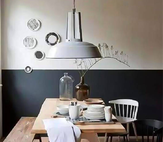半墻指的是將墻面一分為二,分別刷上不同顏色的墻漆。就如圖二所示,下半部分為深色,上半部分則為淺色,這樣的層次連接可以拉伸我們的視覺效果。