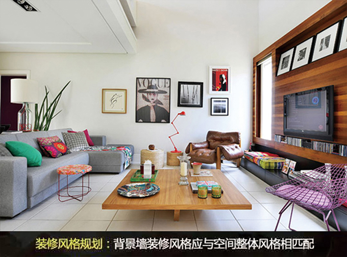 電視背景墻通常是為了彌補(bǔ)房間中電視機(jī)背景墻面的空曠,同時(shí)起到修飾房間的作用。因此背景墻的裝修需要考慮與房間整體裝修風(fēng)格相匹配,否則會(huì)有突兀之感。背景墻風(fēng)格主要是通過(guò)選用合適的裝修材料和顏色搭配以及造型這三方面來(lái)體現(xiàn)的。