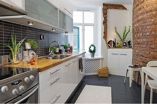 1、首先應考慮烹飪區的功能及實用性,比方說長條形的布局,適宜采用L型的柜體,同時還可加大儲物功能,頂柜用玻璃柜門,增強小廚房的通透性,另外在配色上,切忌花花綠綠,尤其是不能使用應有立體圖案的裝飾材料,否則會讓整體面積顯得更為狹小,還不易清潔。