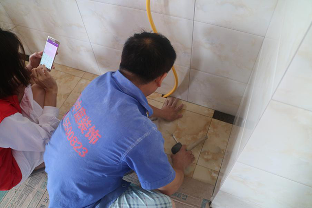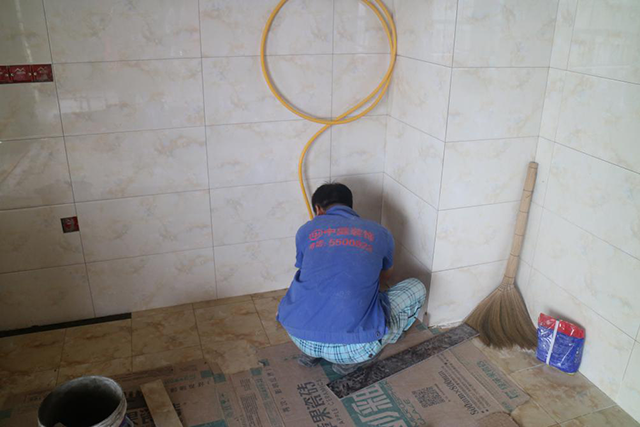 師傅正在忙著給廚房進行鋪貼瓷磚,專業的鋪貼流程,做完一個區域馬上做地膜保護,正在鋪貼的區域也用紙皮做臨時保護,防止沙子刮花地面。
