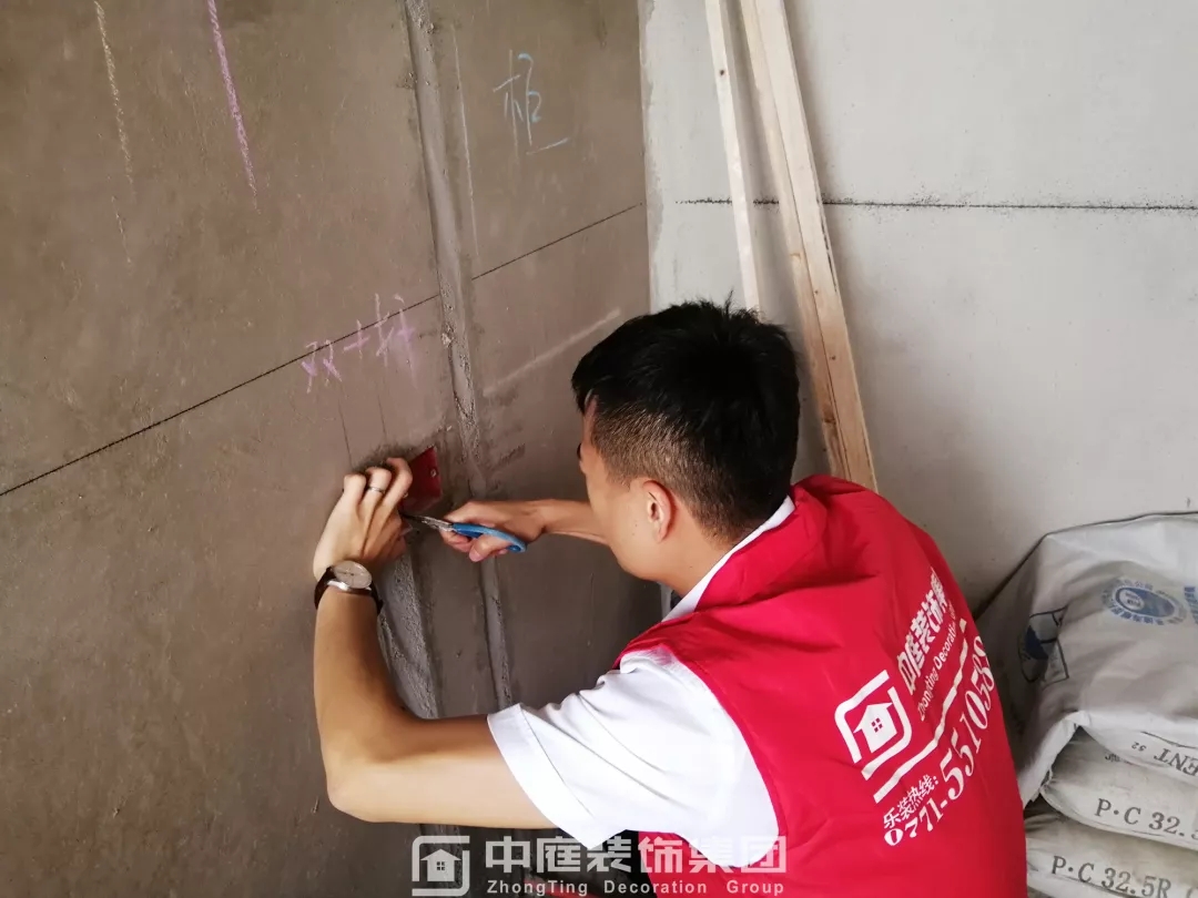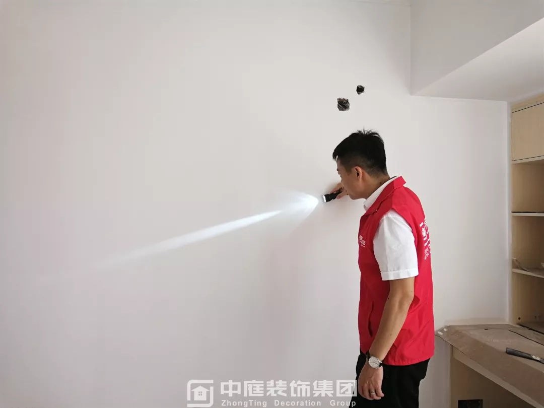 利用強光手電筒檢查墻面平整度及陰角是否達到集團施工標準