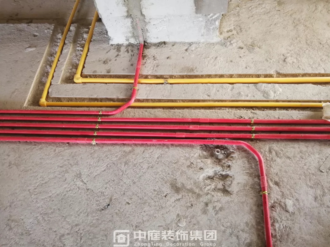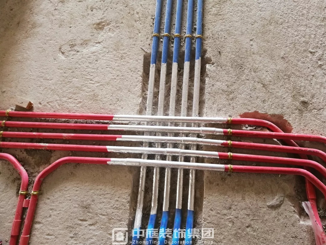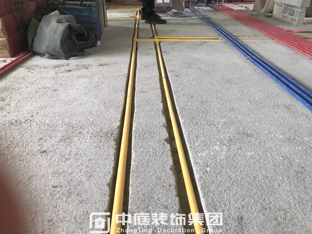 施工現場線管鋪設橫平豎直,按照集團施工規定使用鐵皮卡扣固定,管和管之間留有足夠縫隙,以便鋪設地磚時水泥砂漿進入管下,避免地磚后期出現空鼓;強弱電交匯處,用錫紙包裹保護,可以有效防止對弱電產生信號干擾。