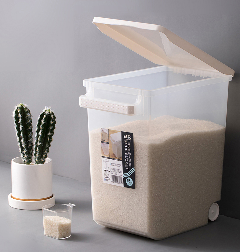 密封膠圈設計,利于密封保存,而且塑料米桶防塵又防潮,容量大,能儲藏30斤大米。設手柄和腳輪,搬運方便,底部是弧形的拐角,利于刮取剩下的少量米。