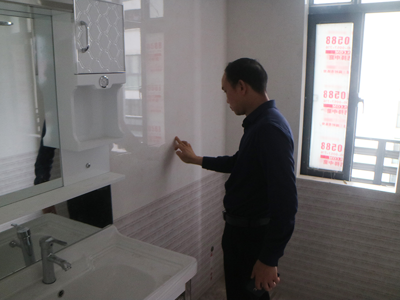 吳總在認真的檢驗瓷磚鋪貼施工工藝