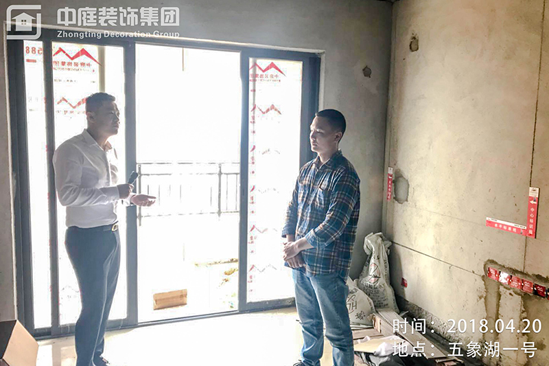 集團總裁丁總與剛好來現場的業主進行交談,業主對公司服務特別滿意,他說到,他平時只有周六周日休息時才會來工地,公司的6大管家都會把每個流程在微信服務群上進行匯報,很放心省心。