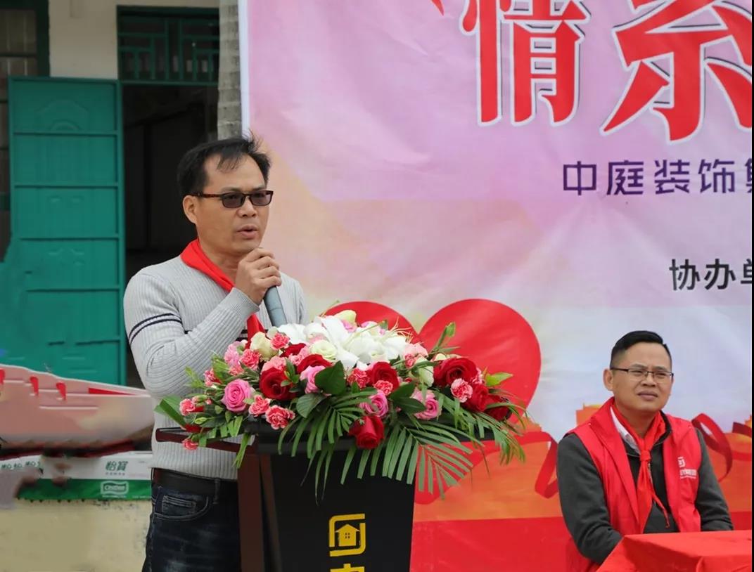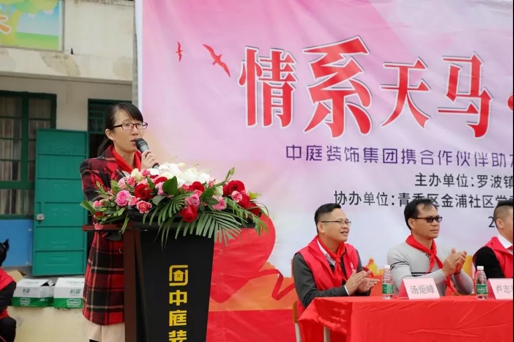 21日上午,羅波鎮(zhèn)副鎮(zhèn)長吳潔、羅波鎮(zhèn)學區(qū)長李宏峰、青秀區(qū)金浦社區(qū)黨委書記許二華、天馬村駐村第一書記覃干思、天馬小學校長盧志善、中庭裝飾集團總裁丁胡與副總裁金洪路、張浩熙、吳文戰(zhàn)以及中庭裝飾集團中高層管理人員、中庭戰(zhàn)略合作伙伴代表、天馬小學全體師生出席參加了此次公益活動。