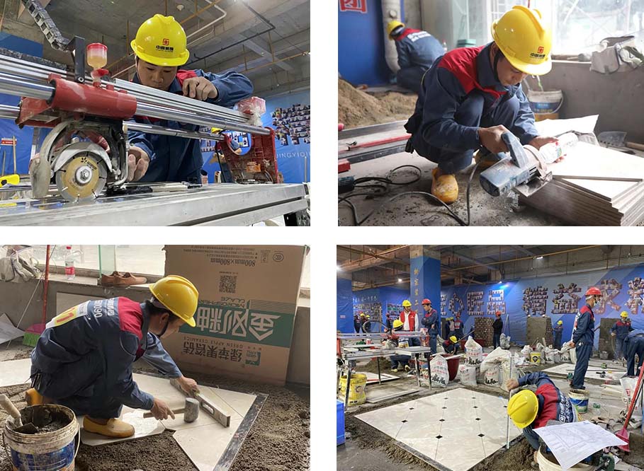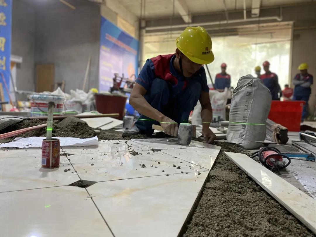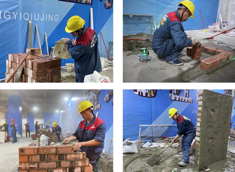 現場一共有土建組、水電組、瓦工組、膩子組四大工種賽區,參賽選手在相對應的工位,根據圖紙要求進行比賽。