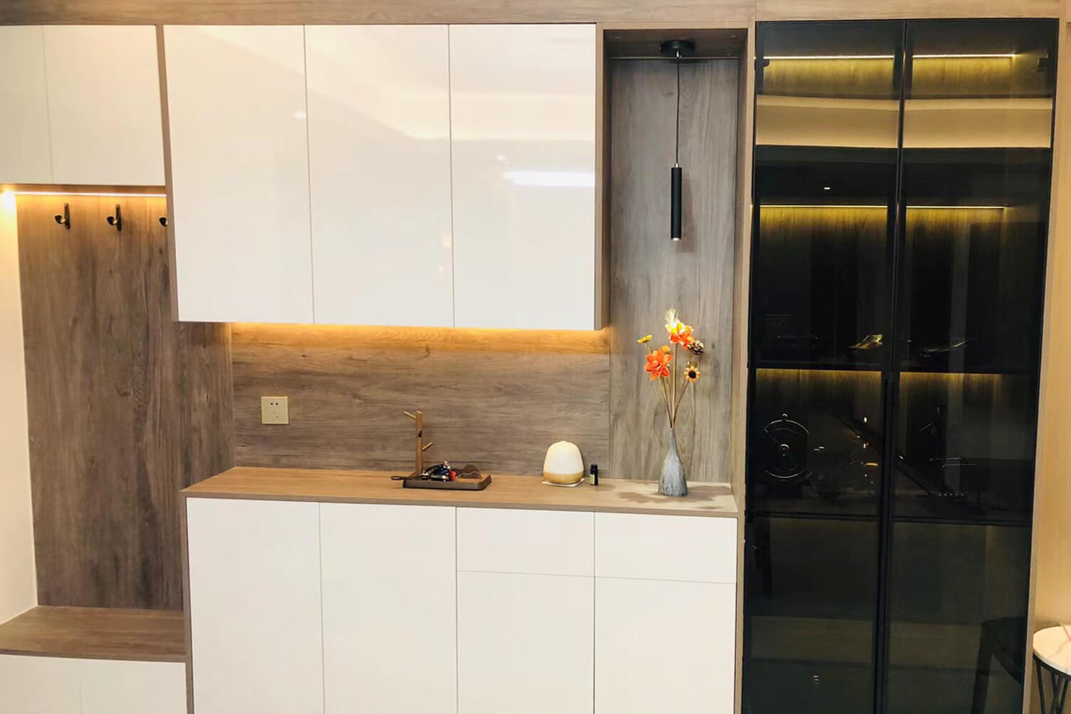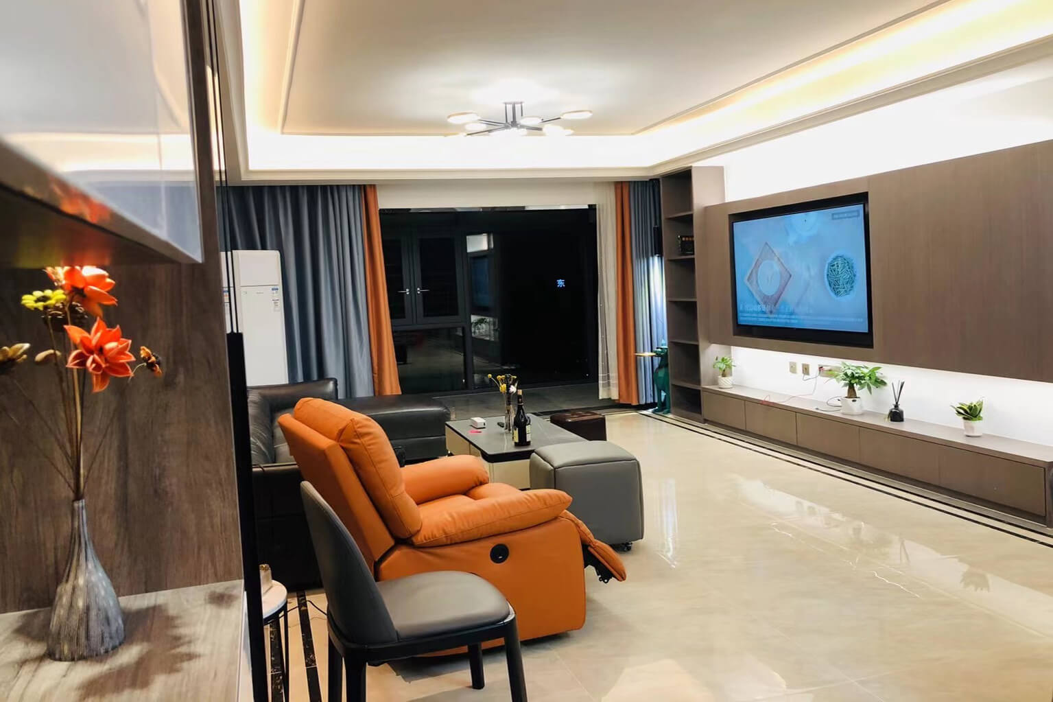 瀏覽量:338客餐廳選擇素色的木飾面顯現低調有內涵,整個客廳及餐廳的吊頂直接一體貫穿,搭配著電視背景墻長方體設計突顯空間的寬闊大氣,愛馬仕橙色的窗簾及單人沙發的呼應,增添了空間的活躍性;暖黃色燈光下白色的大理石吧臺及白色的高光柜門使得空間不再昏沉,局部黑色的鈦金夾著茶色的鏡面在大面積的素色木飾面的包裹下將現代的低調且奢華體現完美的體現了。