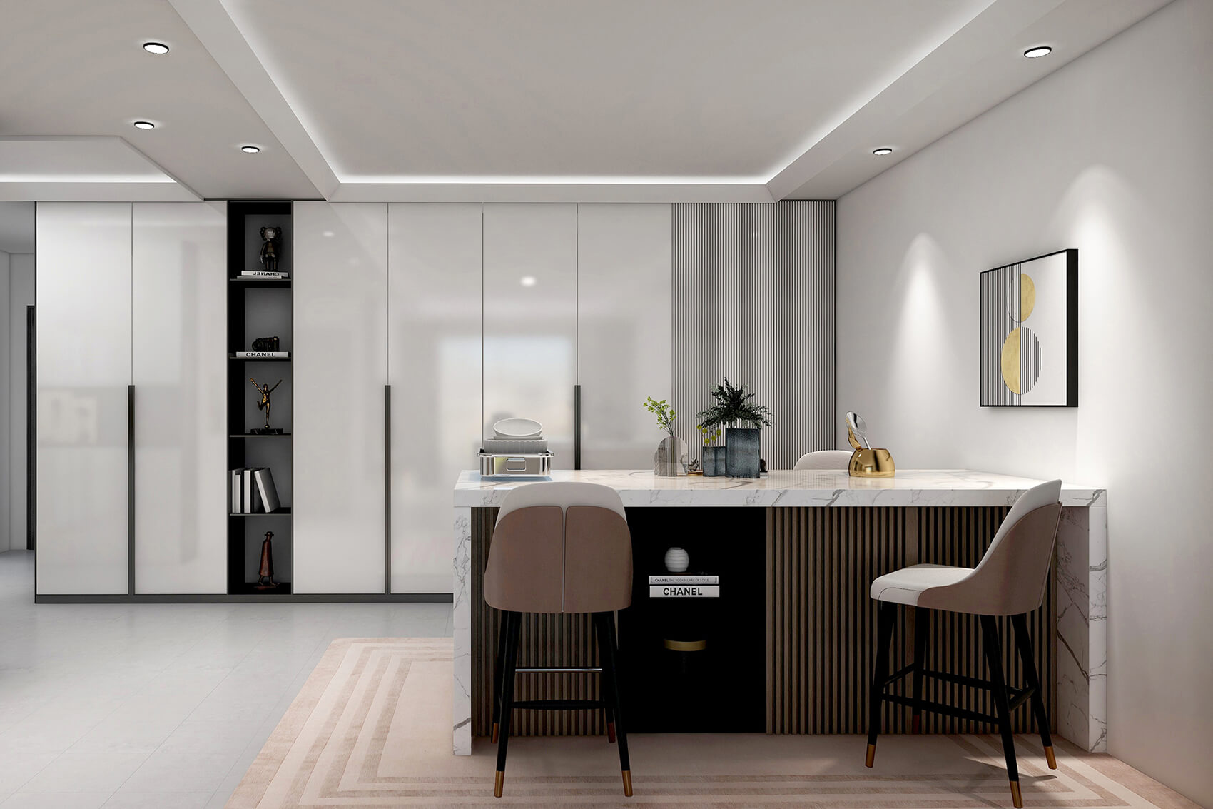 本案總面積134㎡。本案設計師以低飽和度色彩點綴空間,整體簡約大氣,輕奢的家居擺件讓整個家居環境更有質感。