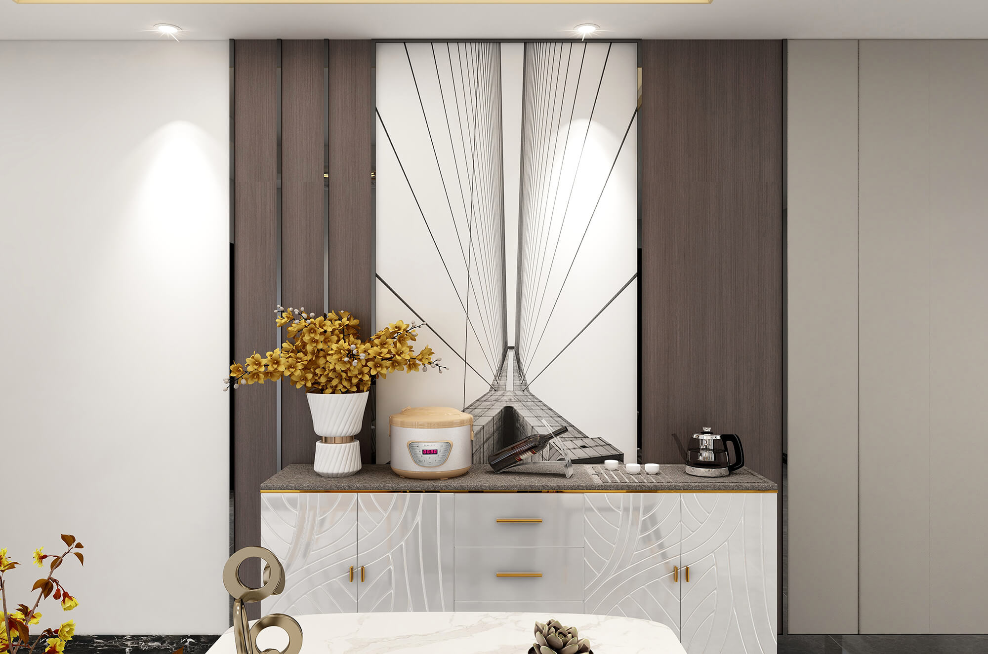 本案整體空間設計時尚大氣、舒適宜居。以淺灰為主色調,在空間與家具中巧妙的糅合了金屬元素,營造出時尚前衛的家居氛圍,適當的玻璃材質、亮色作為點綴,增添精致質感,形成了獨具特色的現代簡約輕奢風格。