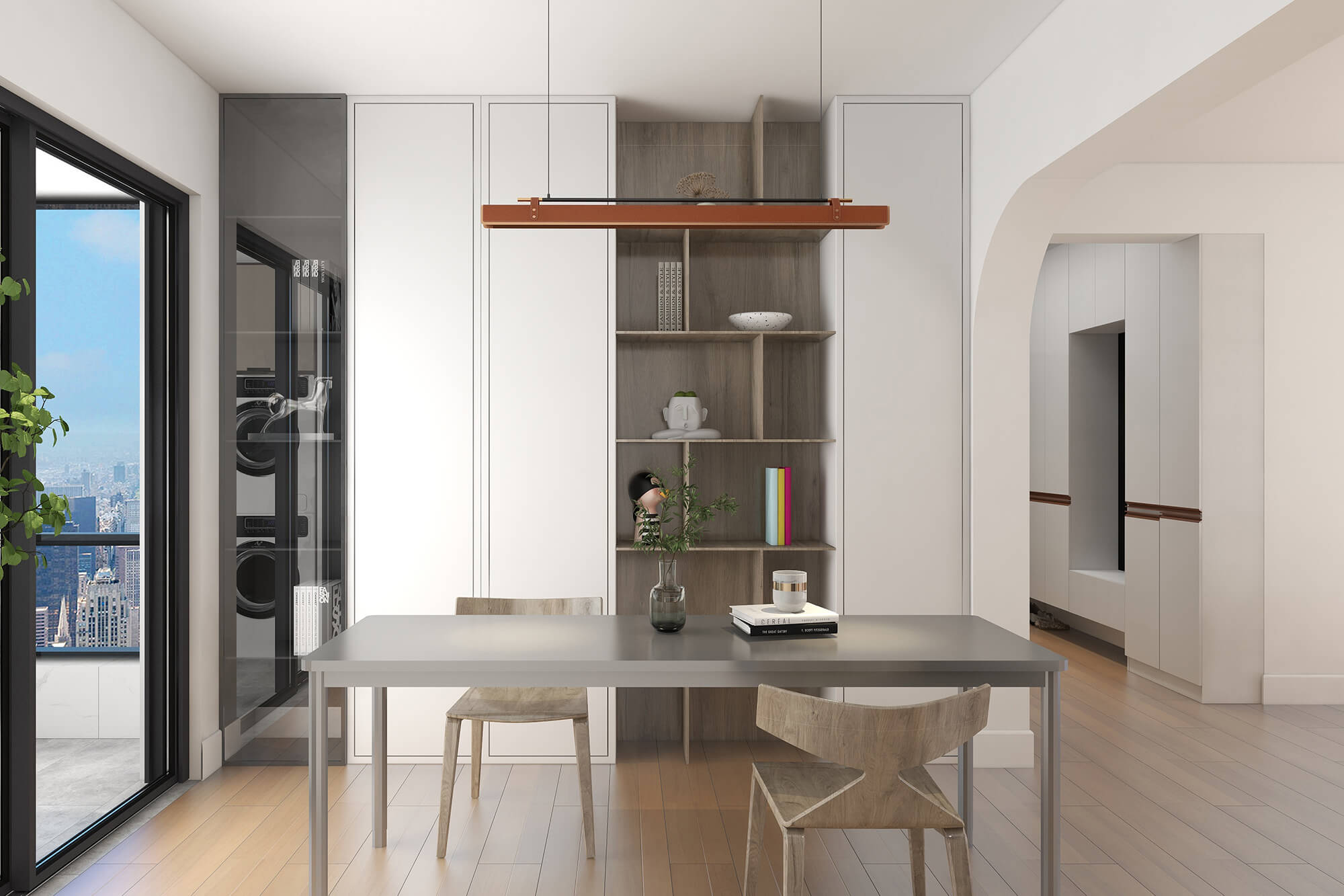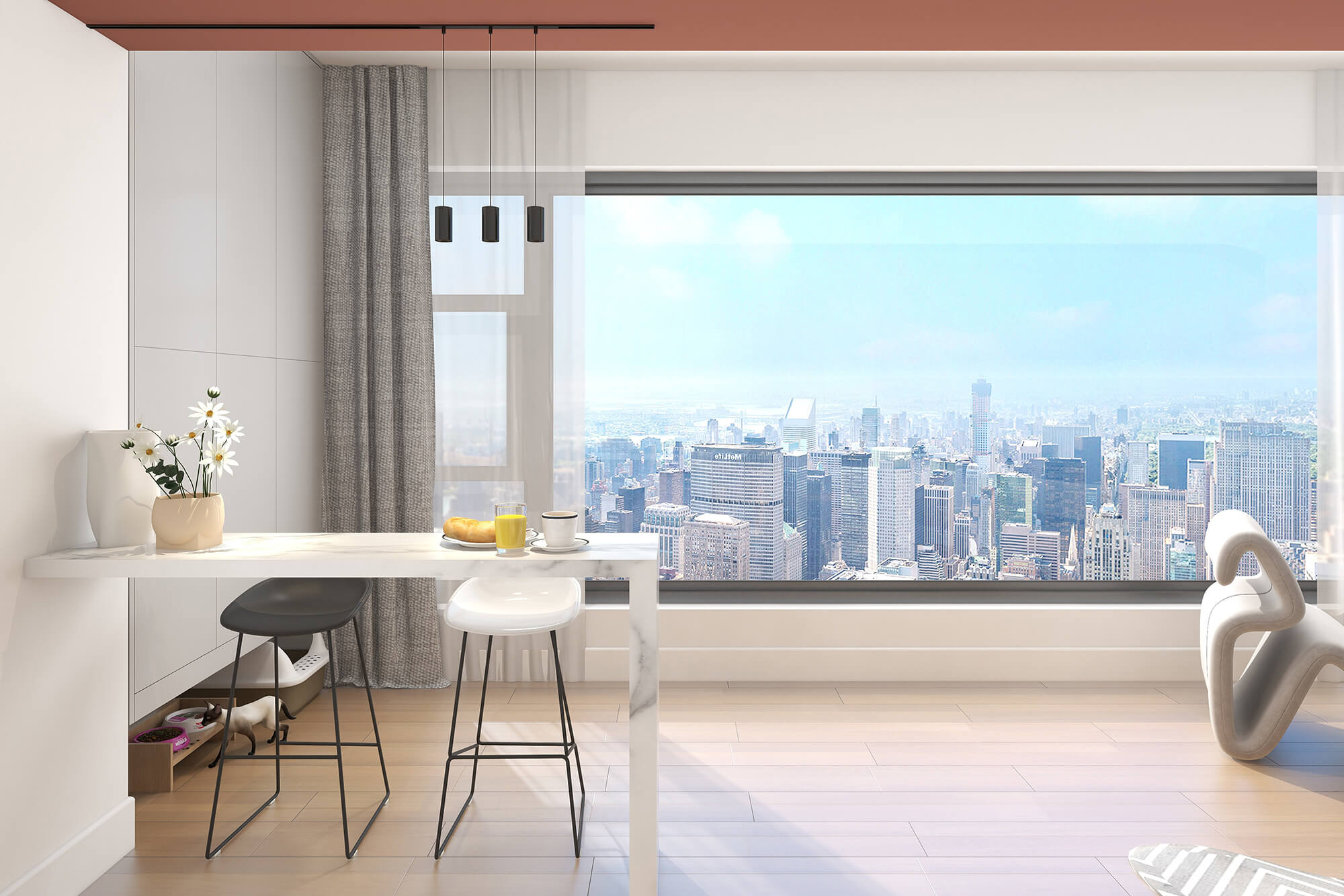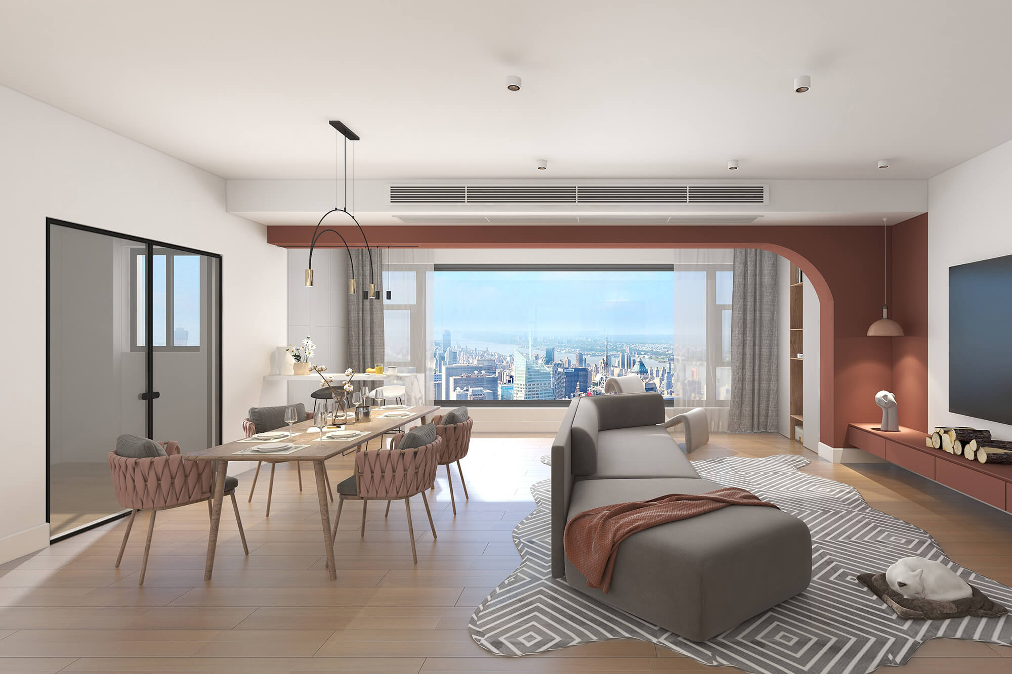 本案設計師基于人與動物、環境之間的大融合的考慮,實現了人們想要追求的一種泛空間,家庭不再是以空間而定位,而是以氛圍而定位。比如說男女主人在辦公的時候,可以在客廳、餐廳跟貓咪玩耍,或者在做飯的時候也能夠和外面的人互動,空間既獨立又融合。