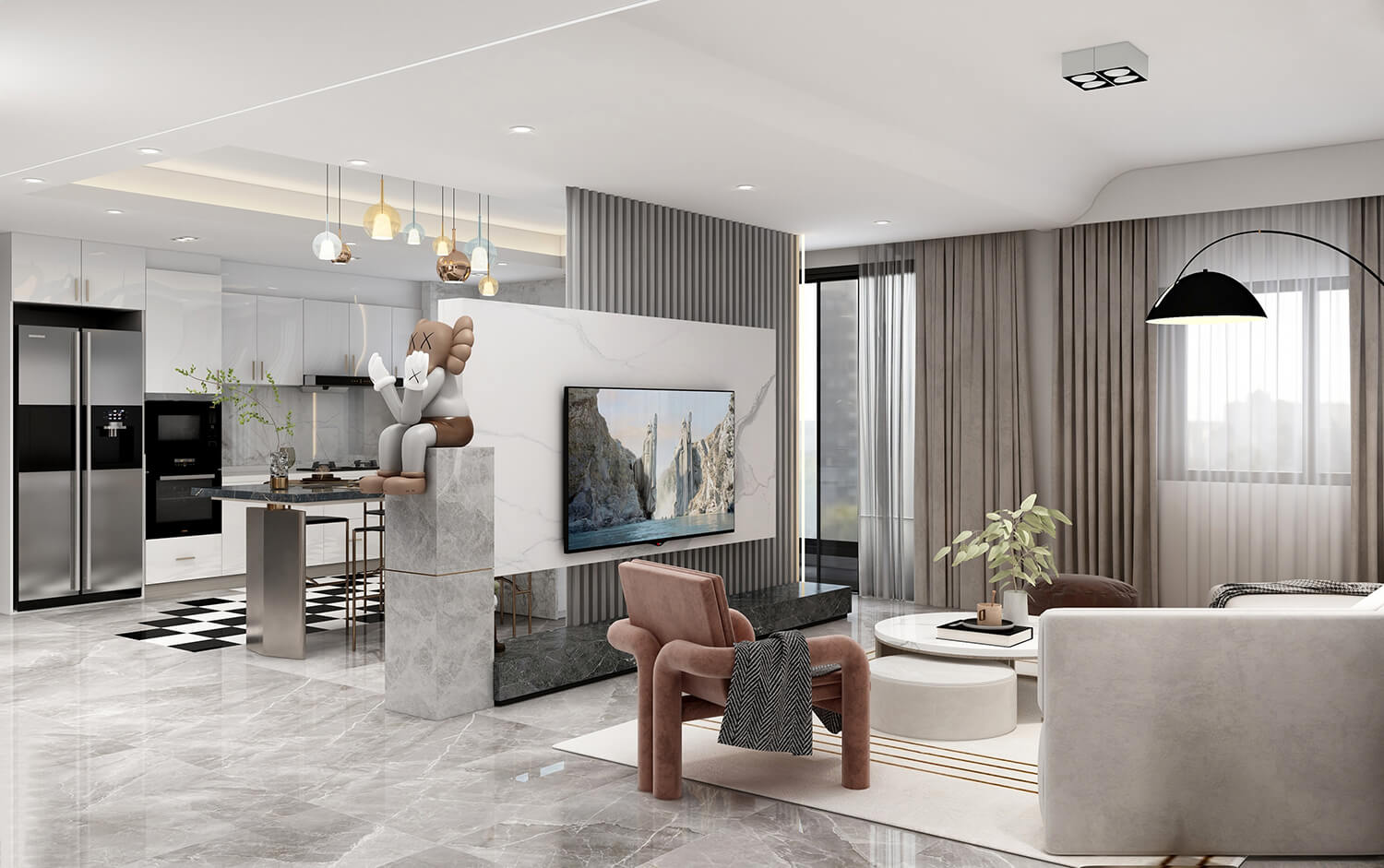 本案戶型為:3房2廳2衛,總面積113㎡。本案設計師通過簡練、流暢而清晰的動線規劃,在空間之外賦予更多的品位與內涵,提升空間品質的同時,創造出具有極高鑒賞性的藝術感染力。