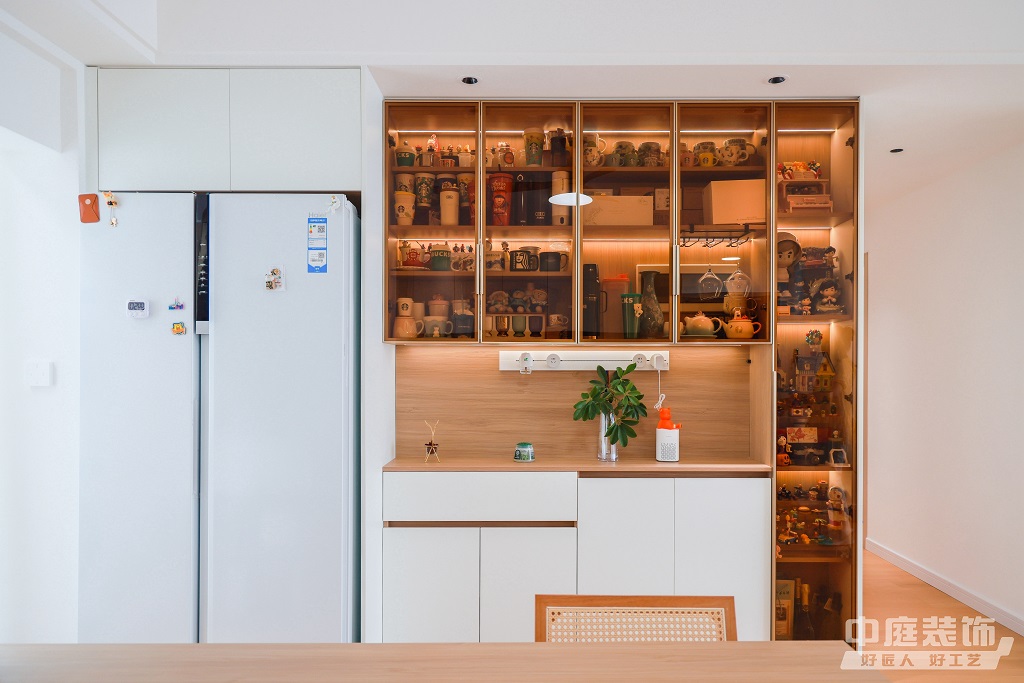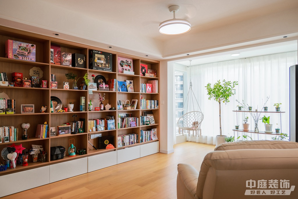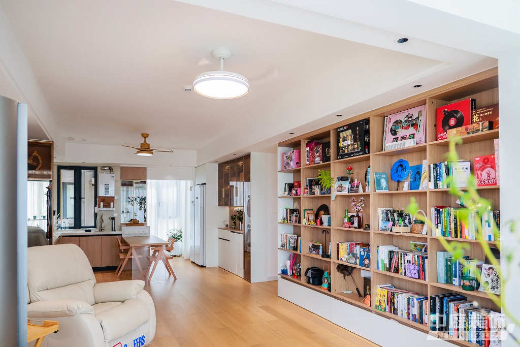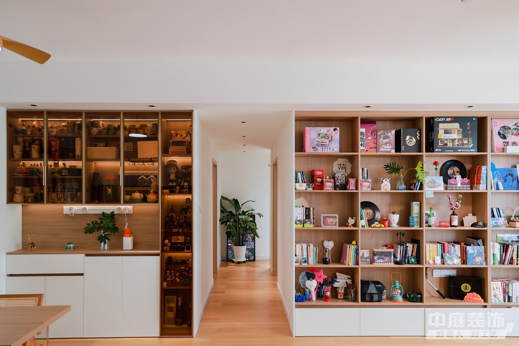仿佛步入了一個自然與簡約交織的溫馨空間。淺色調的木質地板營造出一種質樸而不失高雅的氛圍。客廳中央,去客廳化的設計,一排原木色到頂書架擺滿精心挑選的物件和書籍,一進門就能感受家的溫暖。